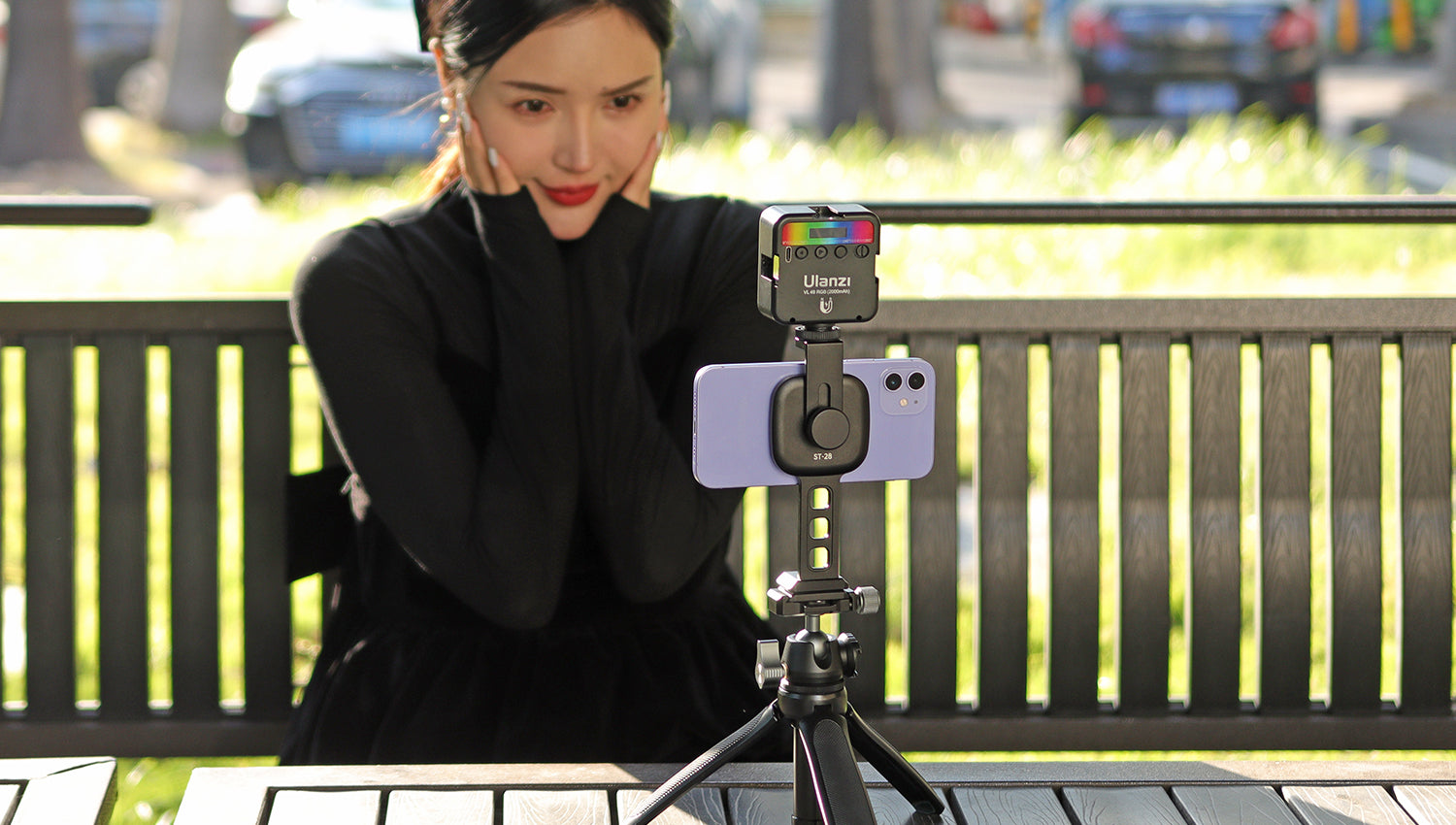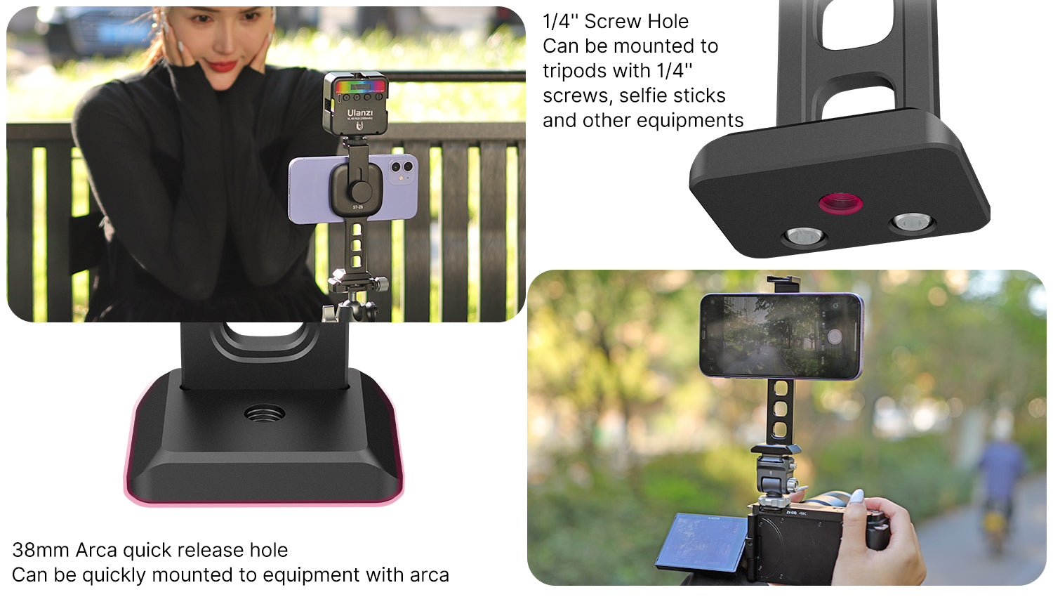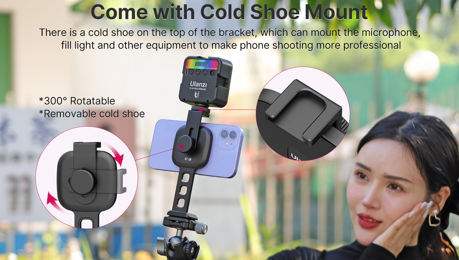 - У верхній частині кронштейна є холодний башмак, на який можна встановити мікрофон, що заповнює світло та інше обладнання, щоб зробити знімання телефоном професійнішим.