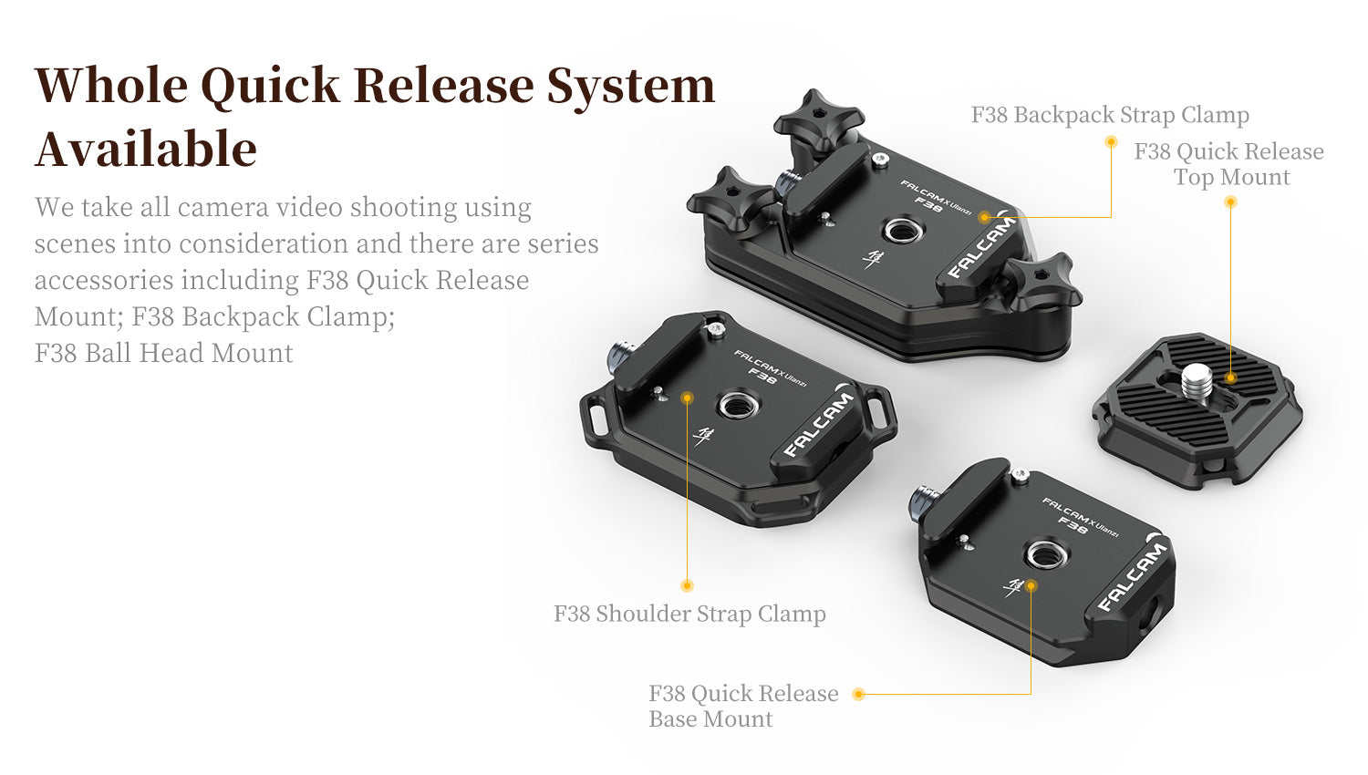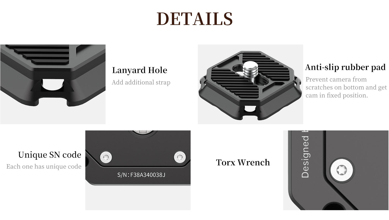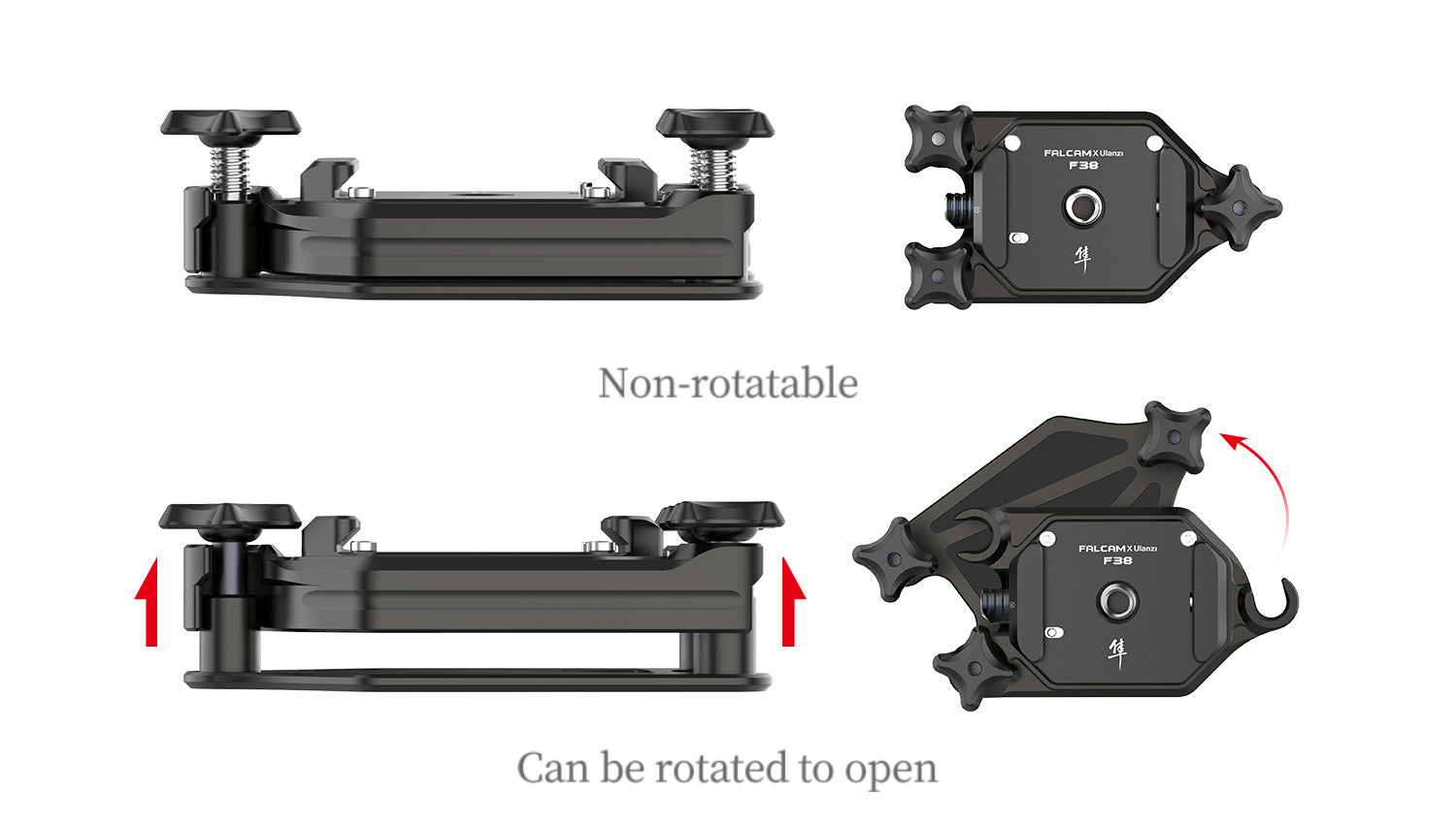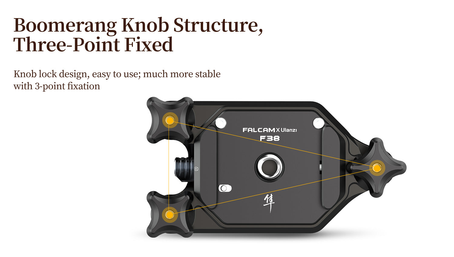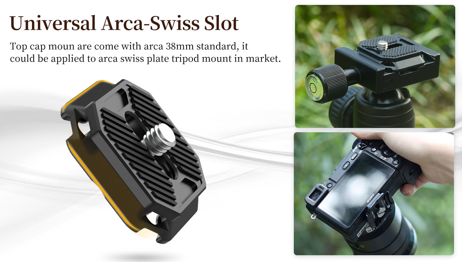 - І базове кріплення, і кріплення на верхній кришці постачаються зі стандартом Arca 38 мм, його можна застосовувати до кріплення для штатива Arca Swiss Plate на ринку.
