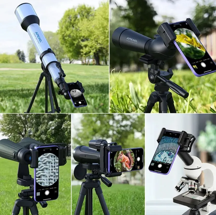 За допомогою адаптера ви зможете легко та швидко встановити на оптичний прилад смартфон, щоб потім із його допомогою робити фотографії або знімати відео. Адаптер сумісний із будь-якими телескопами, мікроскопами, зоровими трубами, біноклями та іншою оптичною технікою. Використовуючи смартфон, ви зможете сфотографувати пояси Юпітера, зняти через бінокль рідкісну птицю, зафіксувати пересування інфузорії-туфельки та відразу ж поділитися своїми фото та відео з друзями та підписниками в соцмережах.